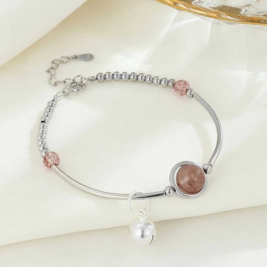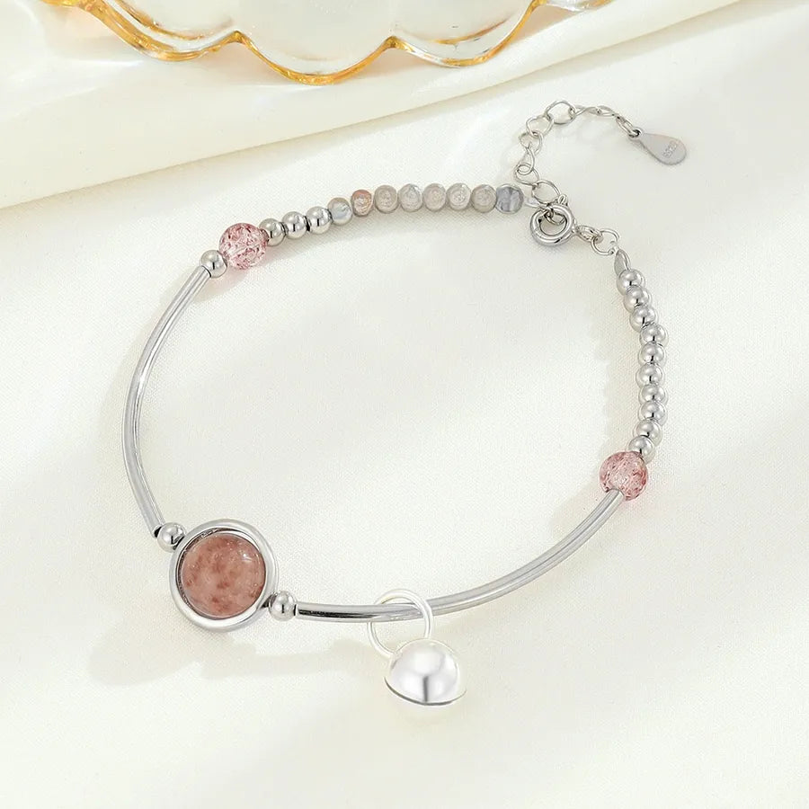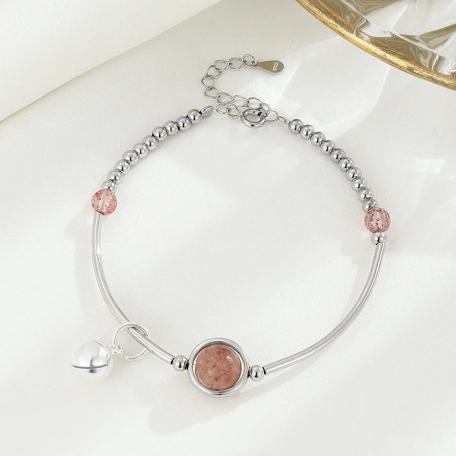 Verleihen Sie Ihrem Handgelenk zeitlose Eleganz mit diesem Armband aus S925er Sterlingsilber mit filigranem geometrischem Design und charmantem Glockenakzent. Das Herzstück bildet ein natürlicher Erdbeerquarzkristall, bekannt für seinen zarten Rosaton und seine romantische Energie. Die Platinierung verstärkt seinen Glanz und seine Haltbarkeit, während die galvanische Oberfläche für langanhaltenden Glanz sorgt. Leicht und vielseitig passt dieses Armband sowohl zu legeren als auch zu formellen Outfits. Ob Sie sich für einen besonderen Anlass schick machen oder Ihrem Alltagslook eine süße Note verleihen möchten – dieses Armband ist das perfekte Accessoire, um Ihren raffinierten und femininen Stil zum Ausdruck zu bringen.