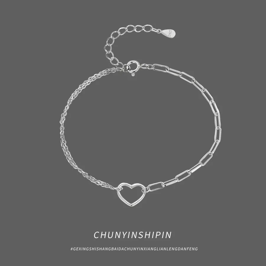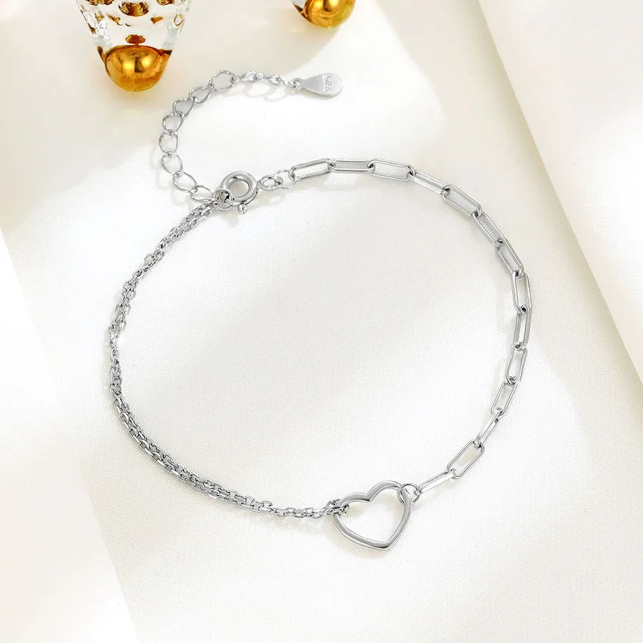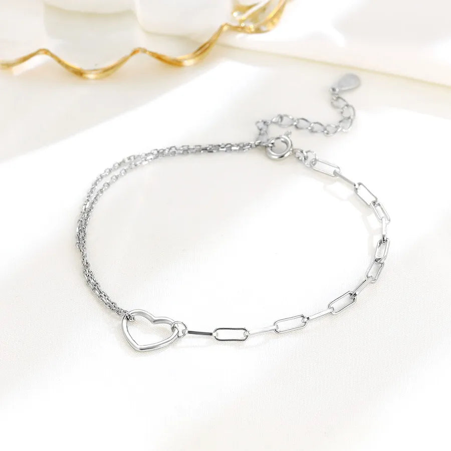 Elegante y atemporal, esta pulsera de plata de ley con doble capa y corazones es el accesorio perfecto para cualquier ocasión. Elaborada con plata de ley 925 de alta calidad, su diseño de cadena de doble capa presenta dijes de corazones entrelazados que simbolizan el amor y la conexión. Ligera y cómoda, añade un toque de sofisticación tanto a conjuntos casuales como formales. Ya sea que te la regales a ti mismo o a alguien especial, esta pulsera es una hermosa expresión de estilo y sentimiento. Su diseño minimalista pero a la moda la convierte en una pieza versátil que complementa cualquier colección de joyas. Eleva tu joyería de muñeca con esta encantadora pulsera de corazones de plata hoy mismo.