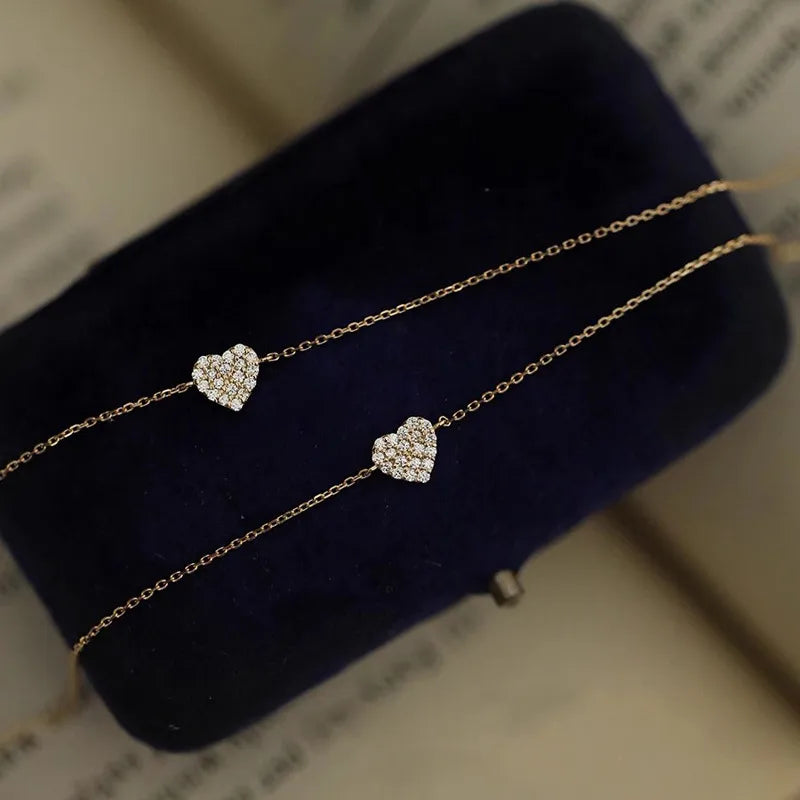 Eleva tu look diario con esta elegante pulsera de corazón elaborada en plata de ley 925 de primera calidad y chapada en oro real. Diseñada tanto para el uso diario como para ocasiones especiales, esta pulsera presenta un delicado motivo de corazón geométrico incrustado con piedras brillantes para un acabado lujoso. La cadena de cable y el cierre de langosta garantizan un ajuste seguro y cómodo. Ya sea que te vistas para unas vacaciones o añadas un toque de encanto a tu atuendo del día, esta pieza versátil combina la elegancia atemporal con un estilo moderno para complementar cualquier guardarropa sin esfuerzo.