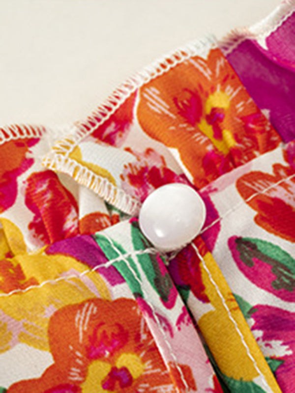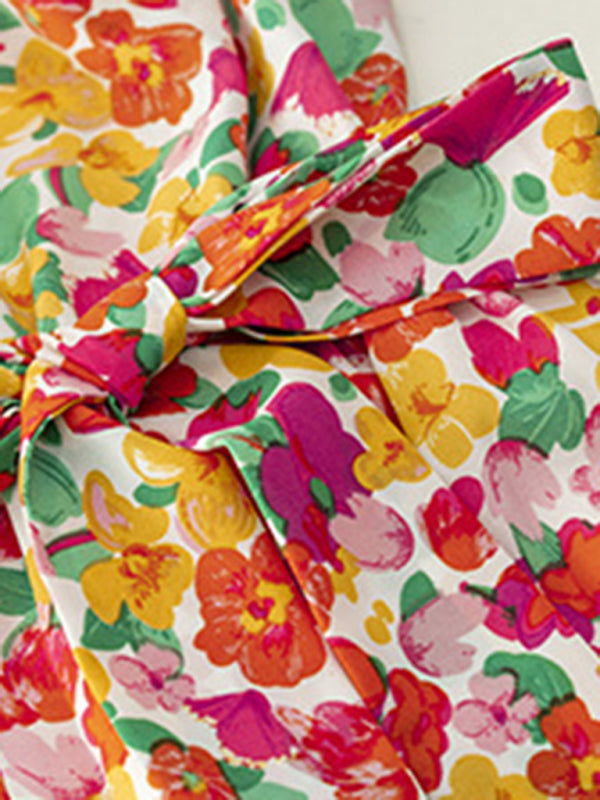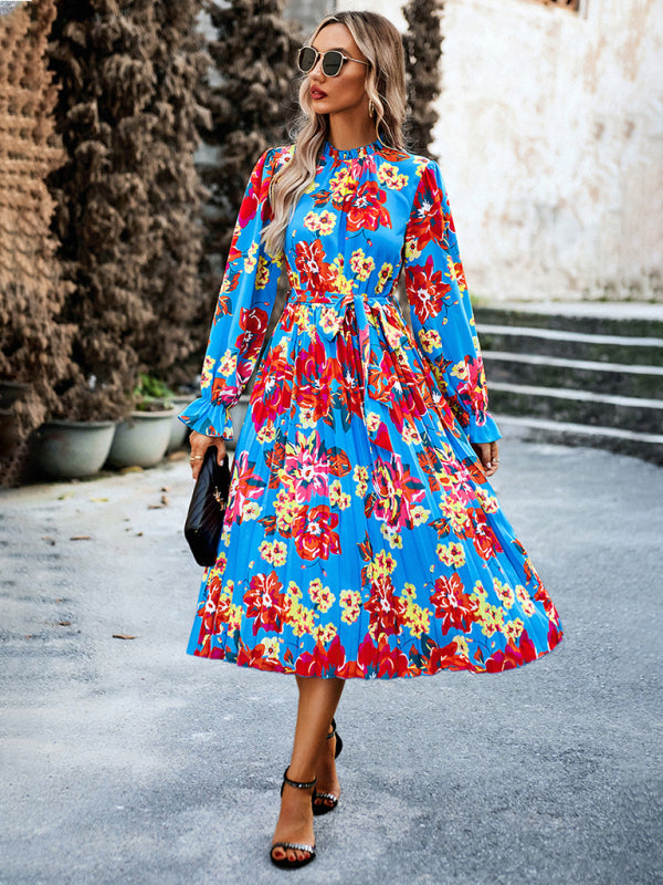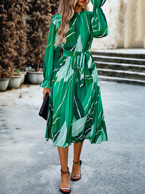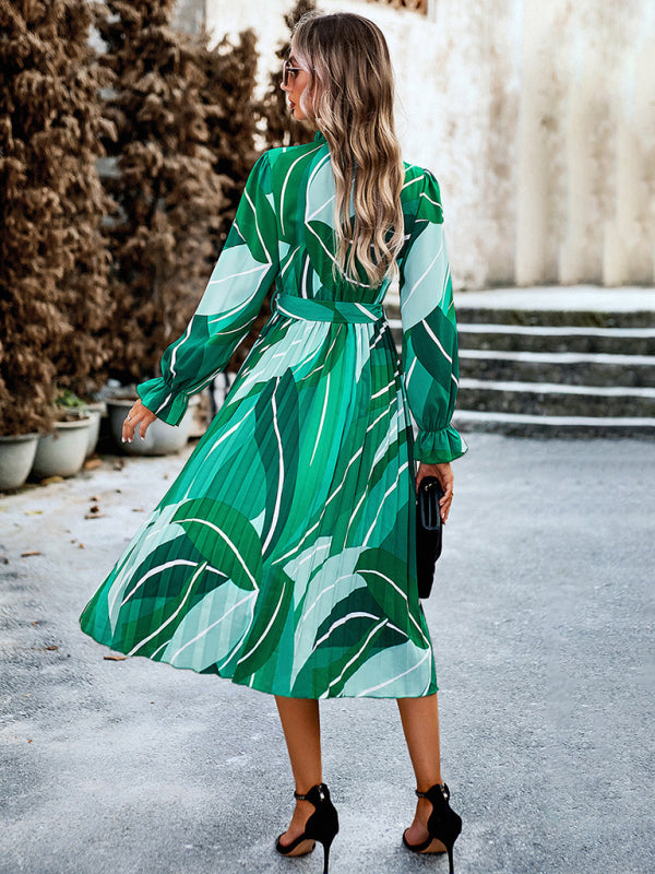 Boho trükitud vöökohaga midi kleit – ümar kaelus, volditud, kevad-suviste stiil