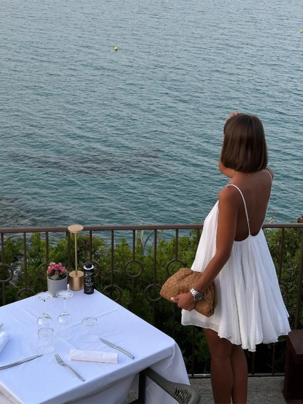 Pööra sel hooajal pead selle kerge, seljata kleidiga, millel on meeldiv sügav V-kaelus ja volditud ääris. Kujundatud päikesepaistelisteks päevadeks, see varrukateta rihmaga kleit pakub õhulist elegantsi ja vaevata glamuuri. Täiuslik valik soojade ilmade puhkusteks või stiilseks koduseks lõõgastumiseks.