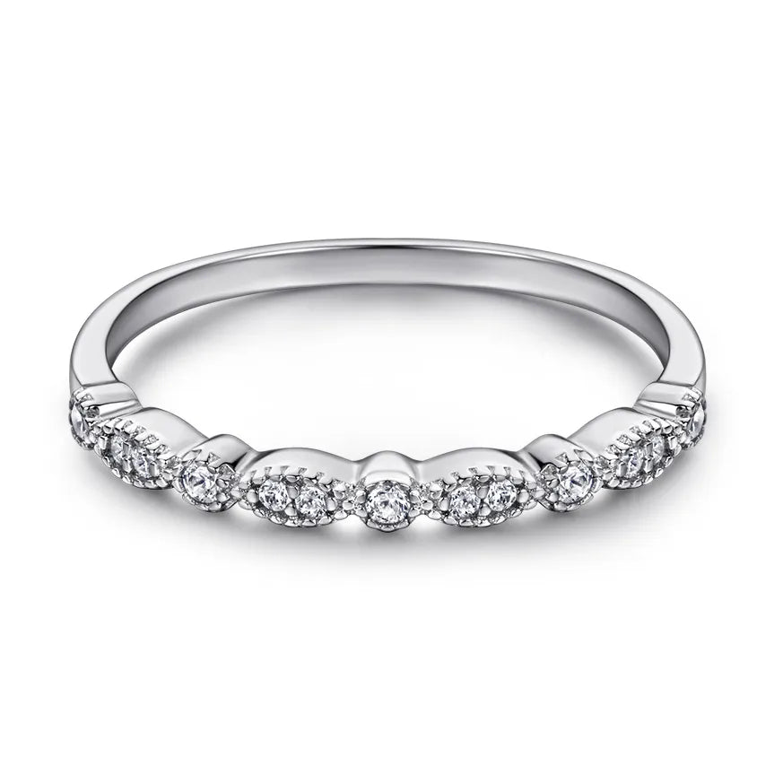 Elevate your everyday look with this elegant S925 sterling silver ring, featuring a half-circle design adorned with sparkling zirconia stones. The geometric pattern adds a modern twist to classic European style, making it a versatile accessory for daily wear or special occasions. Platinum plating enhances its shine and durability, while the lightweight 2g design ensures comfortable wear all day long. Whether you're dressing up for a night out or adding a touch of sophistication to your casual outfit, this ring is a timeless piece that complements any wardrobe effortlessly.