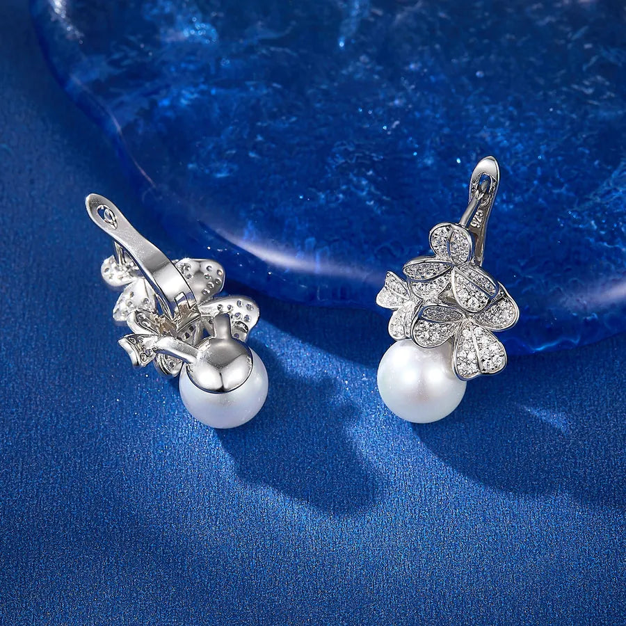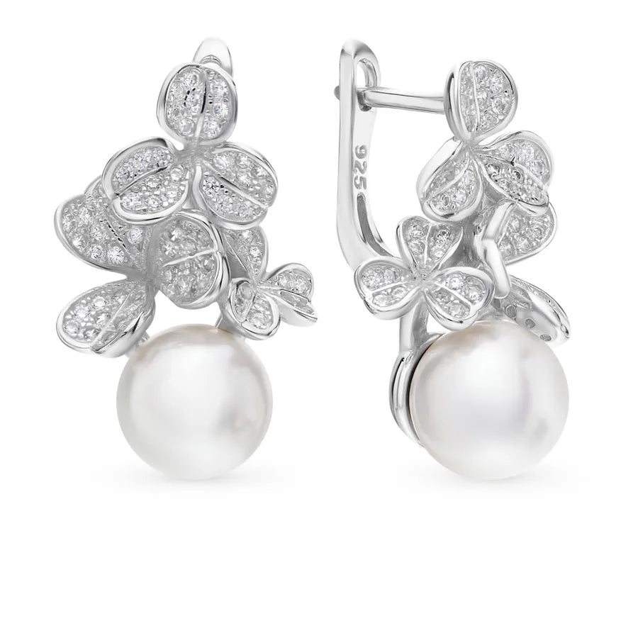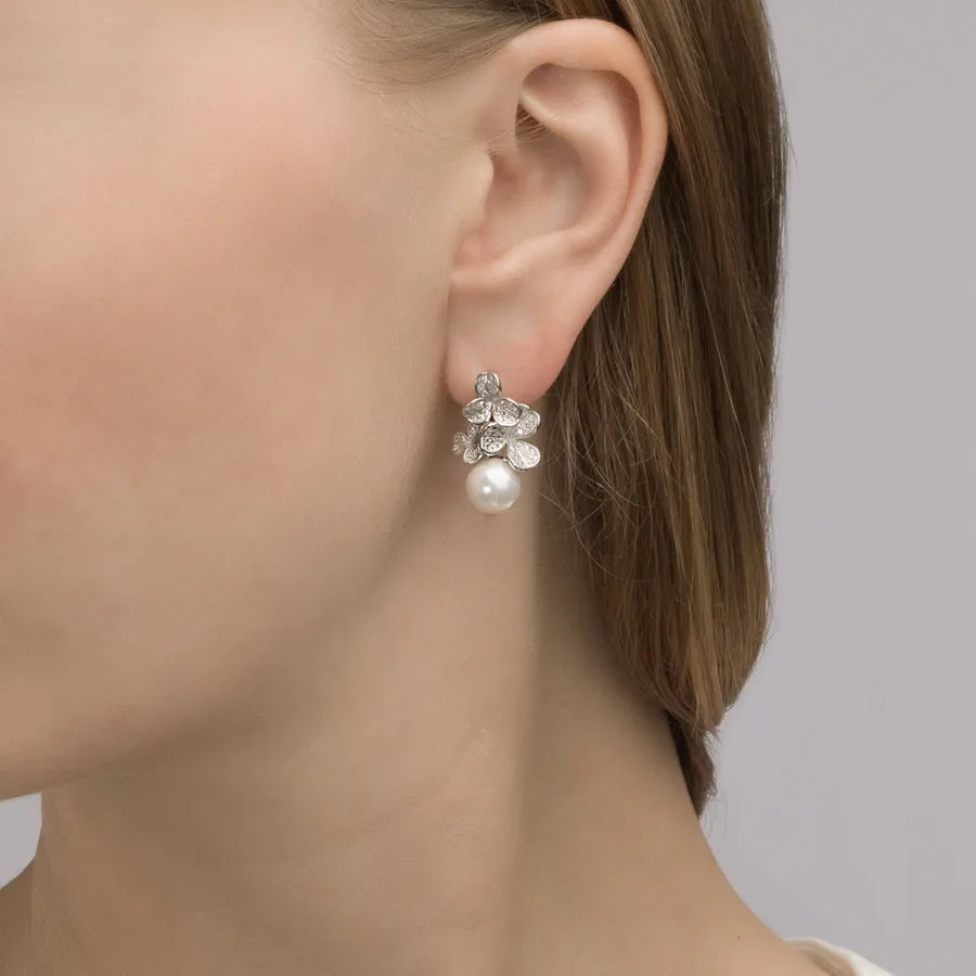 White Gold Plated Pearl Flower Drop Earrings