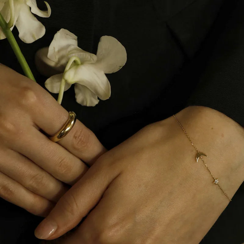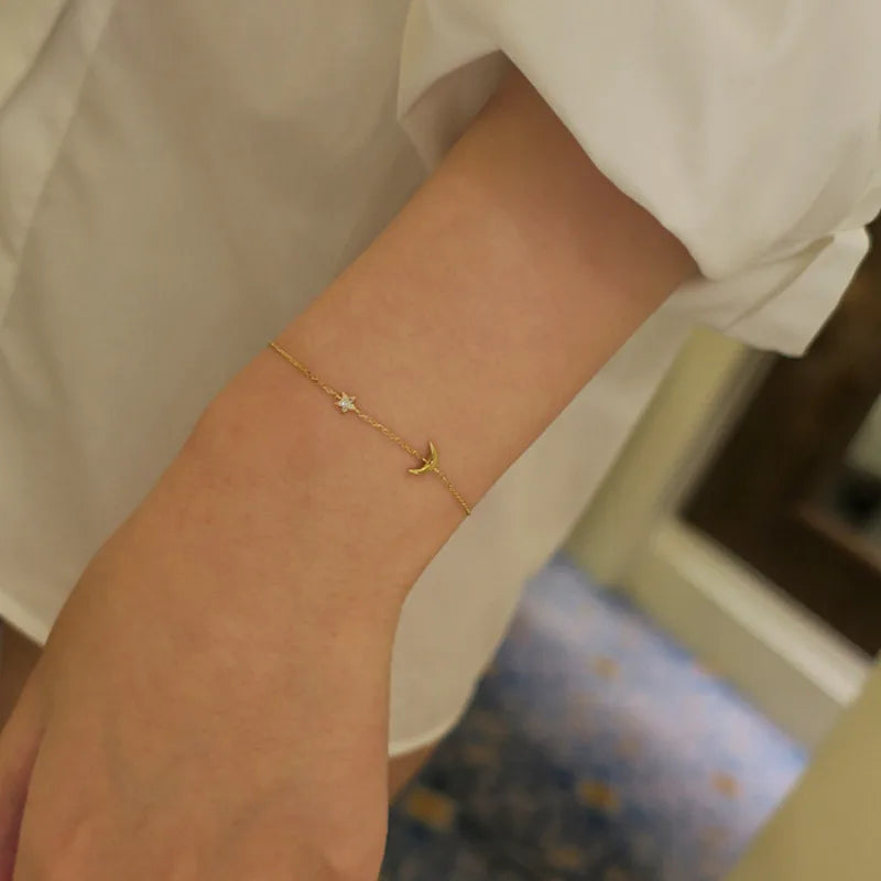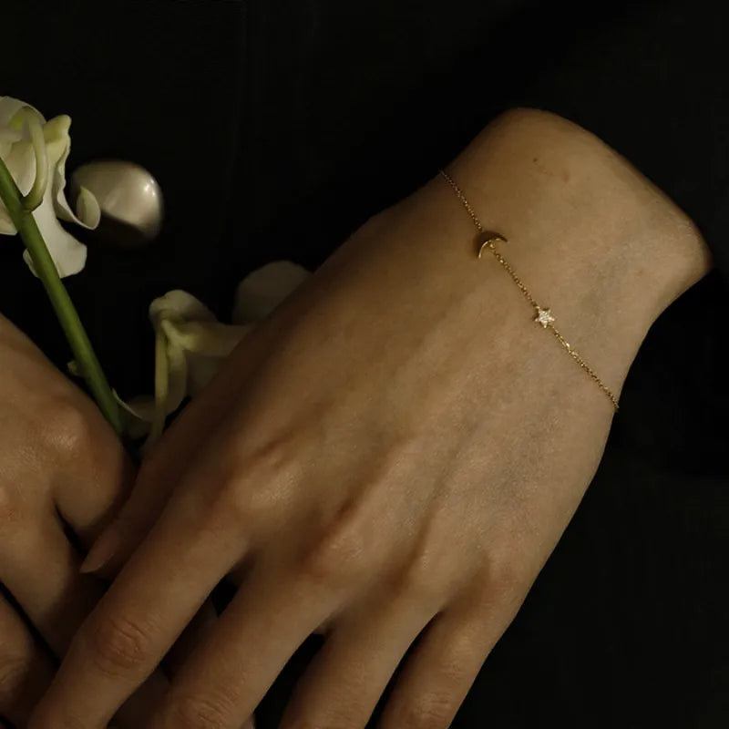 Elevate your everyday elegance with this 14K gold plated moon and star bracelet crafted from genuine S925 sterling silver. Designed for women who appreciate minimalist beauty, this bracelet features celestial-inspired charms that sparkle with every movement. Lightweight and refined, it adds a subtle yet captivating touch to any outfit. Whether worn alone or layered with other pieces, this bracelet is a timeless addition to your jewelry collection. Its cold tone finish and delicate detailing make it perfect for both casual and formal occasions. A must-have accessory for lovers of chic, understated glamor.