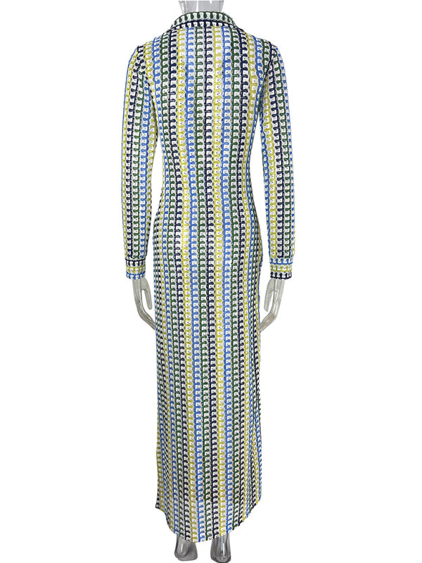 Effortlessly chic and perfect for your next getaway, this low-cut V-neck hollow maxi dress is designed with a breezy silhouette and elegant front slit for carefree movement. The boho-inspired self-design knit makes this a standout for beachside strolls, resort lounging, or sunset dinners.