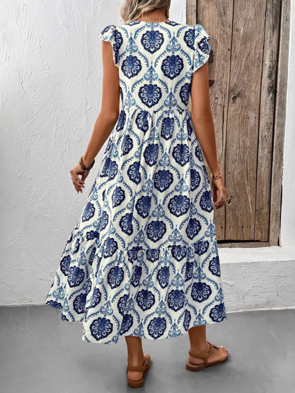 Vacation Loose V-Neck Ethnic Print Long Dress