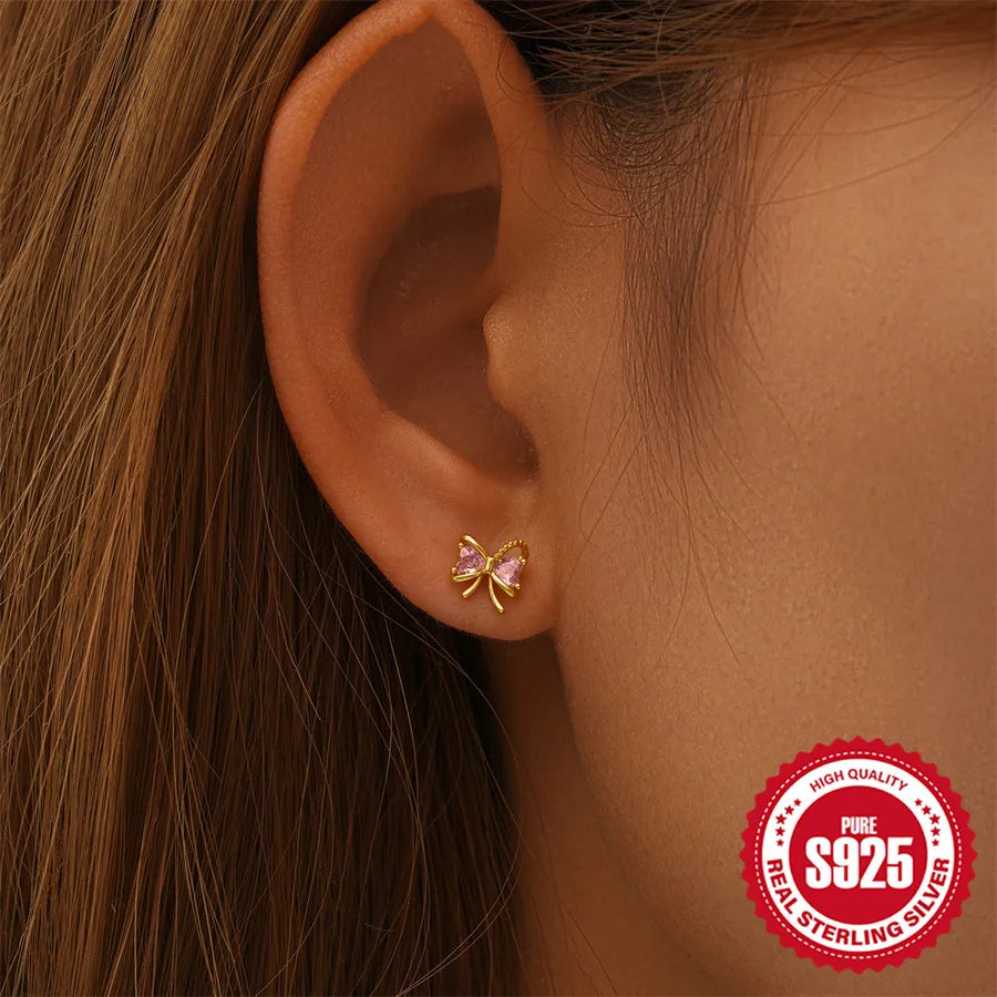 Delicate and charming, these 925 sterling silver ear studs feature a romantic heart shape paired with a graceful bow knot design. Accented with sparkling zircon stones, they add a subtle touch of elegance to any outfit. Perfect for casual wear or as a thoughtful gift, these earrings offer timeless style with a modern twist. Lightweight and comfortable for all-day wear, they are crafted with high-quality materials to ensure durability and shine. Whether you're dressing up or keeping it simple, these earrings are a versatile addition to your jewelry collection.
