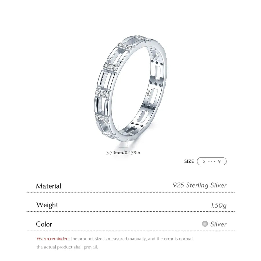 Verhoog je dagelijkse stijl met deze prachtige geometrische ring, vervaardigd uit sterling zilver en afgewerkt met een stralende rhodium plating. Met een uitgesneden ontwerp en fonkelende zirkonium inleg, biedt deze lichte 2g ring een moderne maar elegante touch aan elke outfit. Of je nu naar kantoor gaat, een feest bijwoont of casual gaat winkelen, dit veelzijdige accessoire past bij elke gelegenheid. Ontworpen voor vrouwen die eenvoud waarderen met een modieuze twist, combineert het IG-waardige stijl met tijdloze verfijning. Voeg een vleugje schittering toe aan je sieradencollectie met dit opvallende statementstuk.