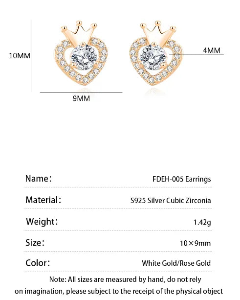 Elevate your everyday elegance with these 925 Sterling Silver Heart Crown Zircon Stud Earrings. Designed for women who appreciate timeless beauty, these earrings feature a delicate heart shape topped with a regal crown, inlaid with sparkling zircon stones. The polished finish adds a refined touch, making them perfect for daily wear, romantic dates, or tea parties. Crafted from high-quality sterling silver, these lightweight studs are gentle on sensitive ears and suitable for all seasons. Their classic yet elegant style ensures they pair effortlessly with any outfit, adding a subtle sparkle and royal charm to your look.