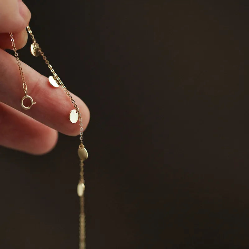 Elevate your everyday style with this dainty 14K gold plated bracelet crafted from genuine S925 sterling silver. Featuring a minimalist geometric coin charm, this bracelet adds a subtle sparkle to any outfit. Its lightweight design and sweet, feminine aesthetic make it perfect for daily wear or as a thoughtful anniversary gift. Whether worn alone or layered with other pieces, this bracelet brings a fresh, modern touch to your jewelry collection. Designed for women who appreciate simplicity and elegance, it's a versatile accessory that complements any wardrobe and occasion with effortless charm.