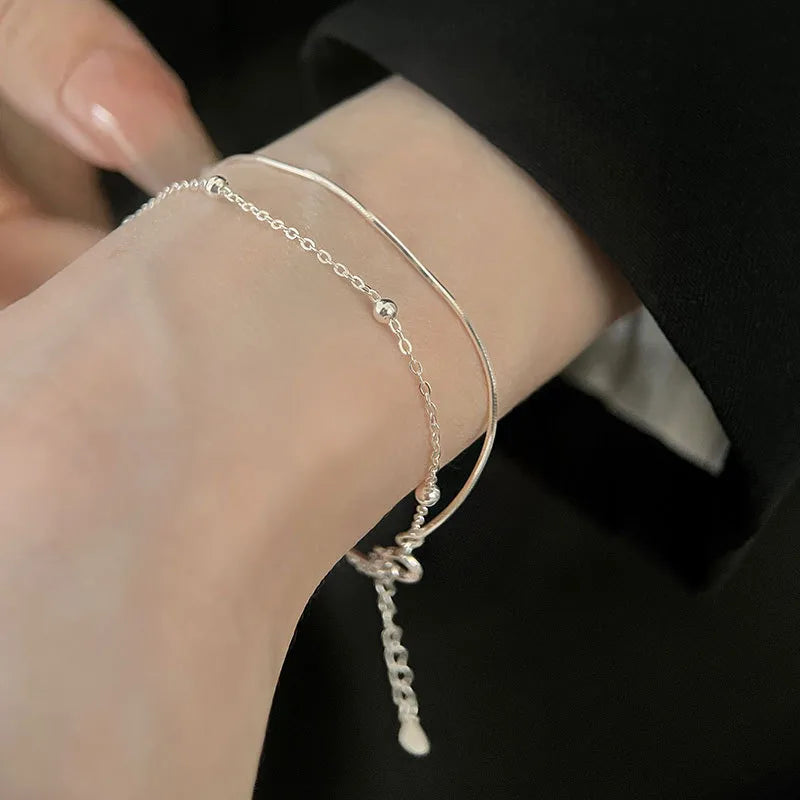 Elegant and refined, this sterling silver double-layer bracelet features a minimalist snake bone design that adds a touch of sophistication to any outfit. Crafted from premium 925 sterling silver, it showcases a sleek geometric pattern that complements both casual and formal looks. Lightweight and comfortable, this bracelet is perfect for daily wear or as a thoughtful gift for a friend. Its timeless style and luxurious finish make it a versatile addition to any jewelry collection. Whether worn alone or stacked, this bracelet brings effortless charm and elegance to your wrist.