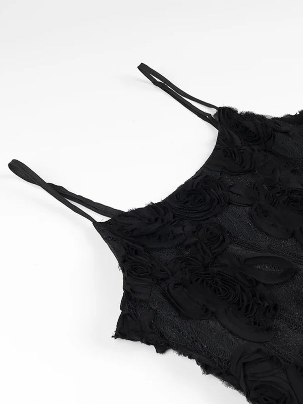 Ruffle Rose Suspender Maxi Dress – Elegant Woven Detail for Vacation & Resort Wear