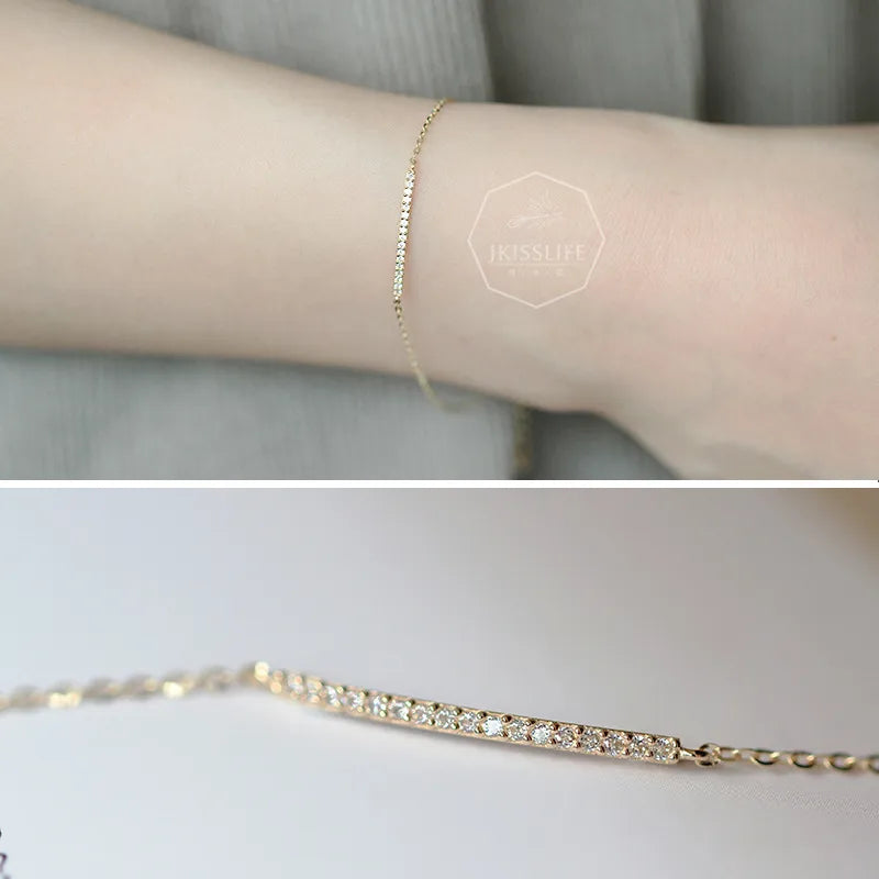 Elevate your everyday style with this ultra-thin 14K gold plated bracelet crafted from premium S925 sterling silver. Designed for the modern woman, its minimalist silhouette is accented with a delicate diamond-inspired detail that adds a subtle sparkle. Lightweight at just 2g, this bracelet offers all-day comfort while delivering timeless elegance. Whether worn solo or layered with other pieces, it’s the perfect accessory for any occasion—from casual outings to formal events. A versatile addition to any jewelry collection, this bracelet effortlessly blends sophistication with simplicity for a refined, polished look.