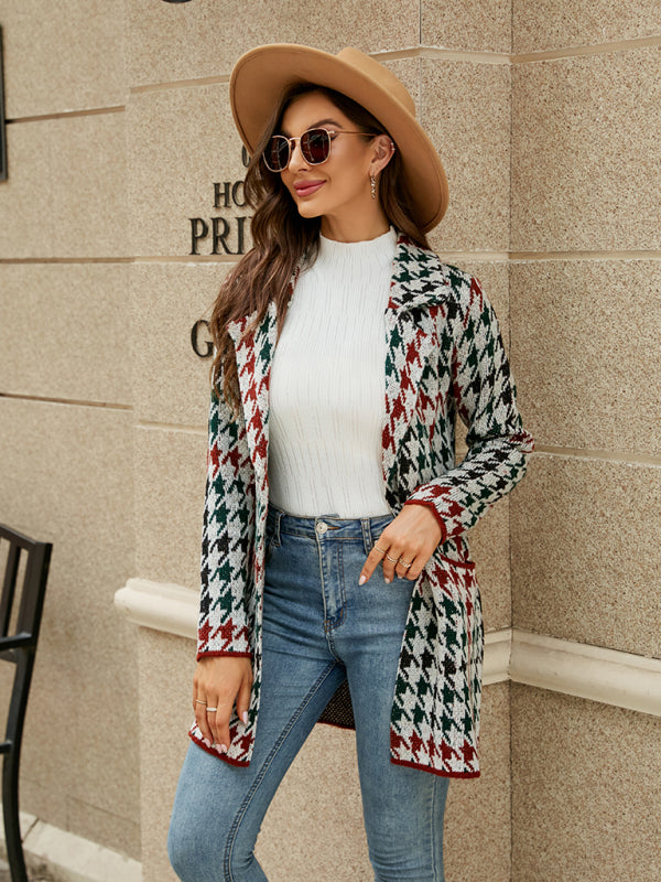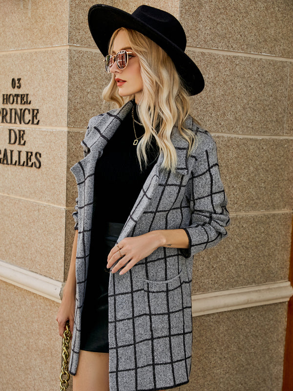 Damski kardigan z dzianiny w pepitkę z klapami