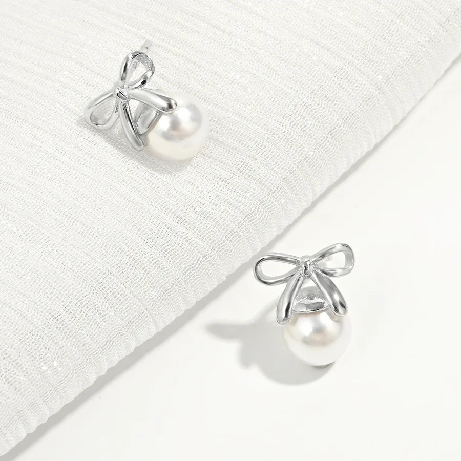 Sterling Silver Bow Knot Pearl Stud Earrings