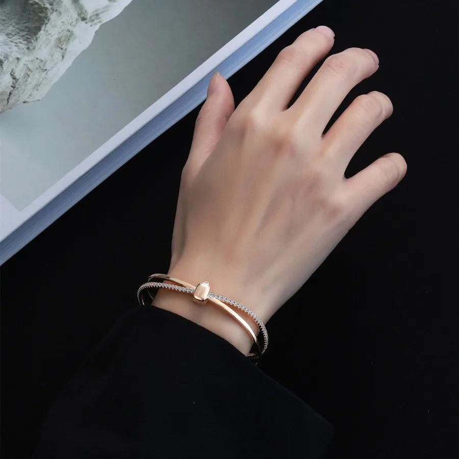 Elevate your accessory game with this elegant Champagne Gold Double Ring Bracelet crafted from genuine 925 sterling silver. Featuring a geometric design and shimmering zircon inlays, this bracelet adds a refined touch to any outfit. The long-lasting gold plating ensures durability and shine, making it perfect for both casual tea parties and festive holiday gatherings. Lightweight yet striking, its simple elegance suits a variety of styles. Whether you're dressing up or down, this bracelet offers timeless charm and a modern twist, making it a must-have addition to your jewelry collection.