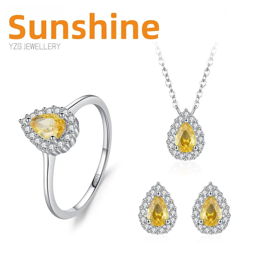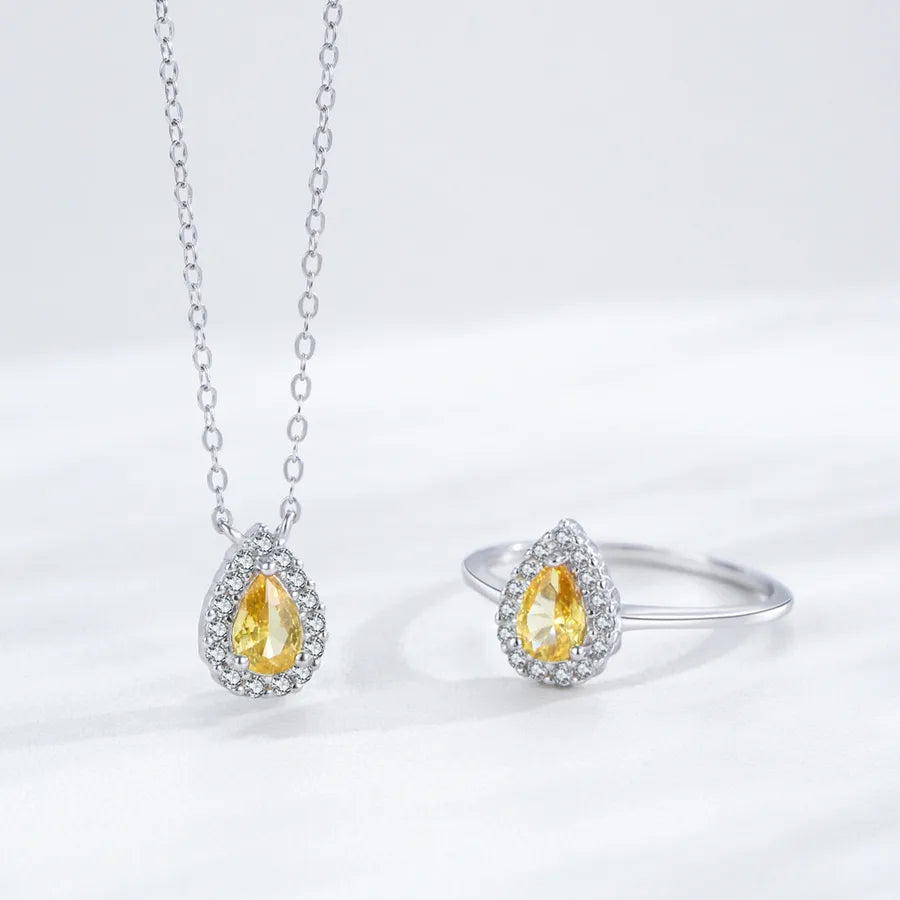 Elevate your elegance with this luxurious three-piece bridal jewelry set, featuring a matching necklace, earrings, and ring. Crafted from genuine 925 sterling silver and finished with a platinum-plated PVD coating, each piece showcases a stunning yellow zircon in a graceful waterdrop design. Perfect for weddings, formal events, or daily wear, this set blends timeless sophistication with modern flair. Designed for women who appreciate refined beauty, it’s an ideal gift or personal indulgence. Lightweight and versatile, this jewelry set complements any outfit and suits all seasons, making it a must-have addition to your collection.