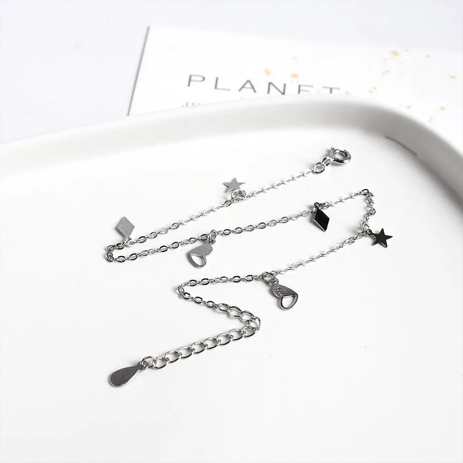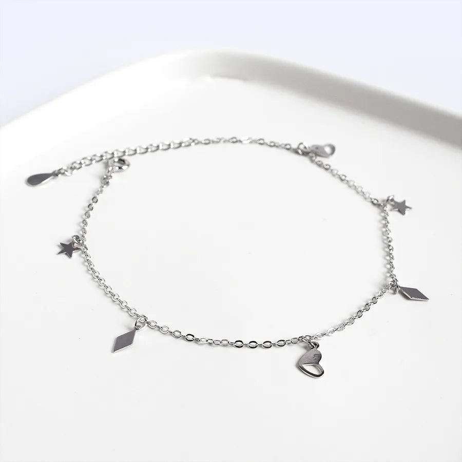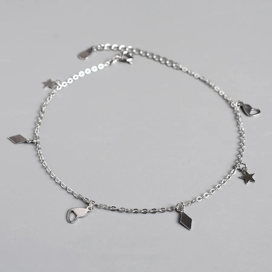Delicate and timeless, this minimalist sterling silver anklet features charming star and heart accents that add a subtle sparkle to your step. Crafted from high-quality 925 sterling silver and plated with platinum for enhanced shine and durability, this ankle bracelet is perfect for beach days, casual outings, or adding a touch of elegance to everyday wear. Its geometric design and simple diamond shape make it a versatile accessory for any wardrobe. Lightweight and comfortable, it’s ideal for women who appreciate understated beauty and refined style. Elevate your ankle jewelry collection with this elegant piece.