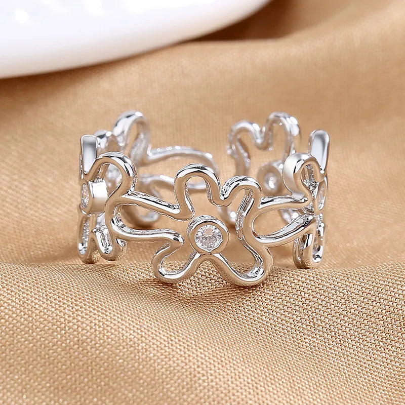 Elevate your everyday look with this elegant 925 sterling silver open ring, designed in a delicate floral shape. Featuring a hollow-out bohemian style and polished finish, this lightweight ring adds a touch of sophistication to any outfit. Inlaid with sparkling zircon, it’s perfect for holidays, tea parties, or casual wear. The open design ensures a comfortable, adjustable fit for all-day wear. Whether you're dressing up or down, this timeless accessory complements every season and occasion. A must-have for women who love simple yet refined jewelry with a boho-chic twist.