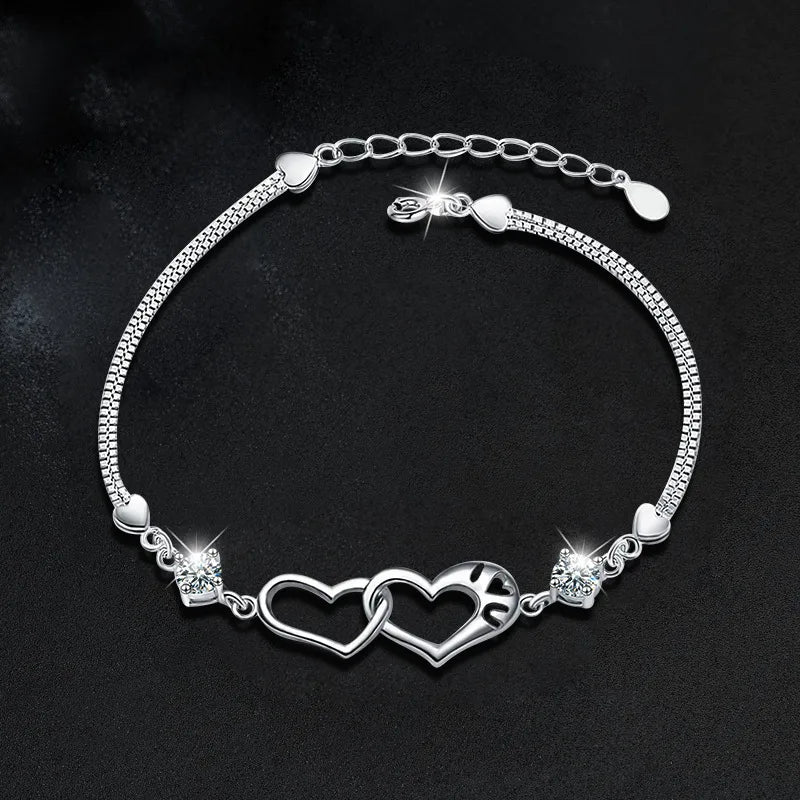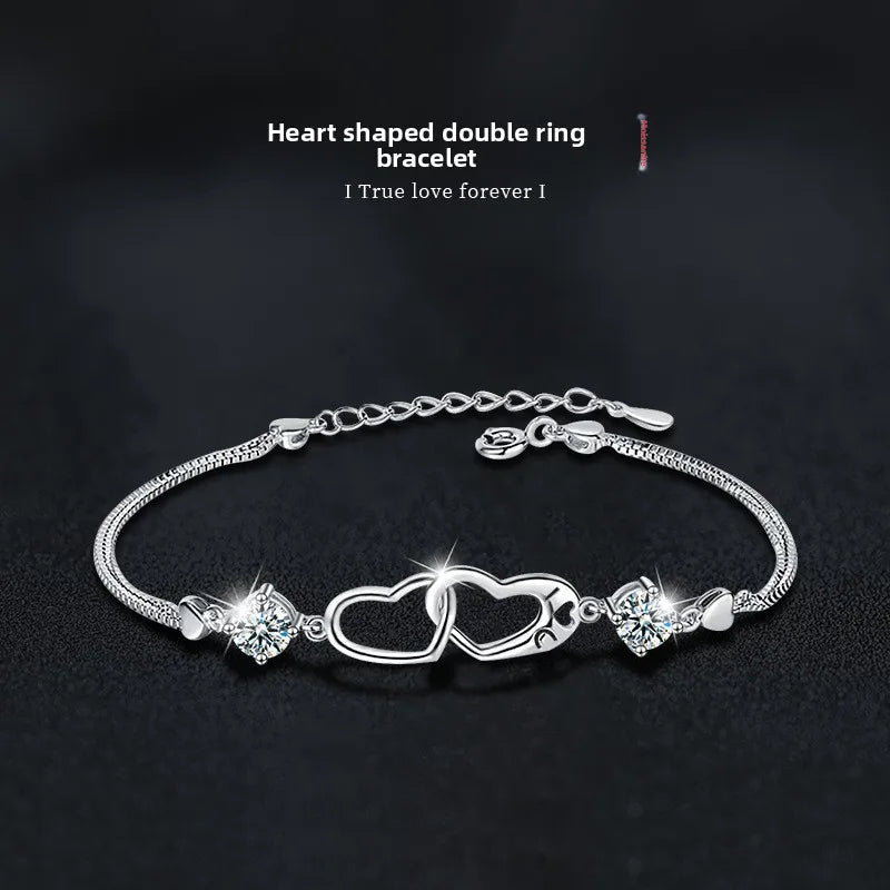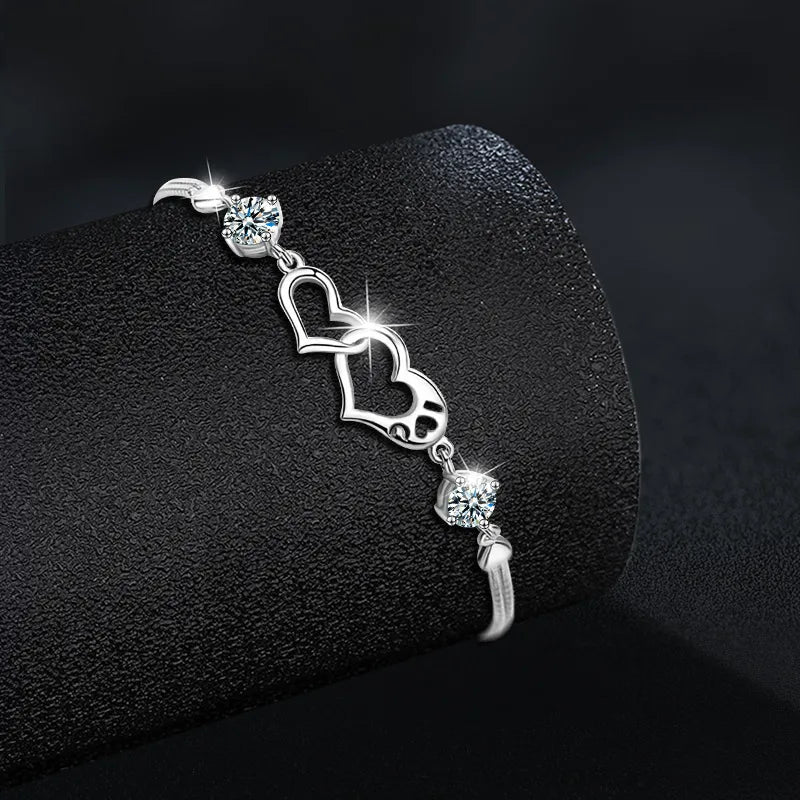 Delicate and timeless, this 925 silver bracelet features a charming heart-shaped design with dazzling moissanite stones. Crafted for elegance and everyday wear, the double ring detail adds a modern twist to a classic silhouette. Rhodium plating enhances shine and durability, making it a perfect gift or personal keepsake. Lightweight and stylish, this bracelet complements both casual and formal outfits. Whether worn alone or layered with other pieces, it brings a touch of sparkle to any look. Designed for women who appreciate refined jewelry with a sweet and elegant flair, this bracelet is a must-have accessory.