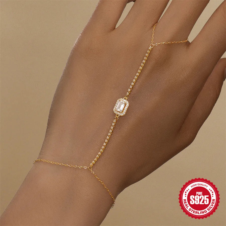Elevate your jewelry collection with this elegant sterling silver bracelet ring chain. Featuring a geometric rectangular diamond design and delicate tassel chain, it blends modern minimalism with timeless sophistication. Crafted from high-quality S925 sterling silver, this piece is lightweight and comfortable for all-day wear. Whether you're dressing up for a formal event or adding a touch of sparkle to your everyday outfit, this bracelet ring chain is the perfect accessory. Its claw-inlaid detailing ensures secure placement of the diamond, offering both durability and style. A must-have for women who appreciate refined, high-grade jewelry.
