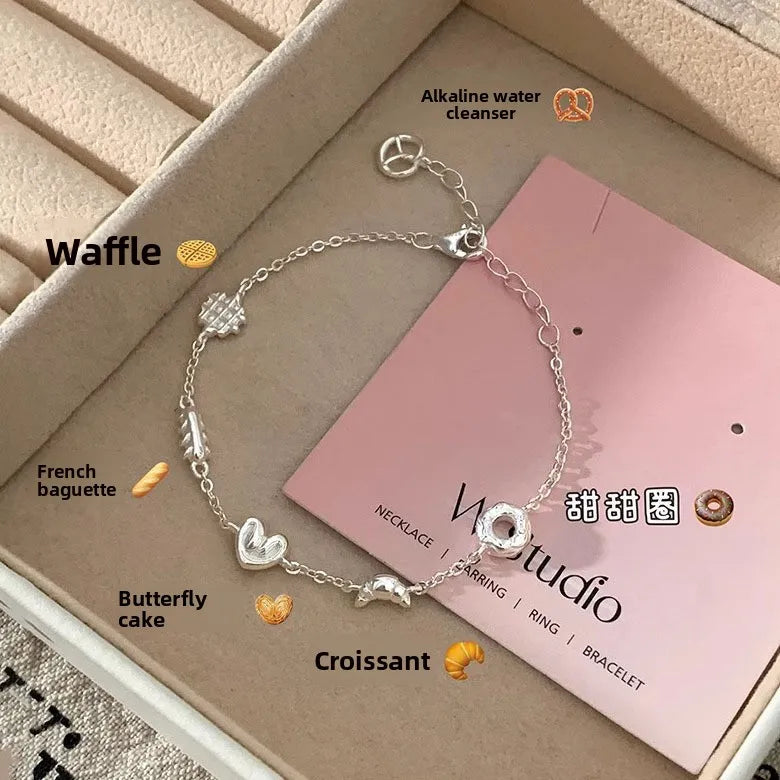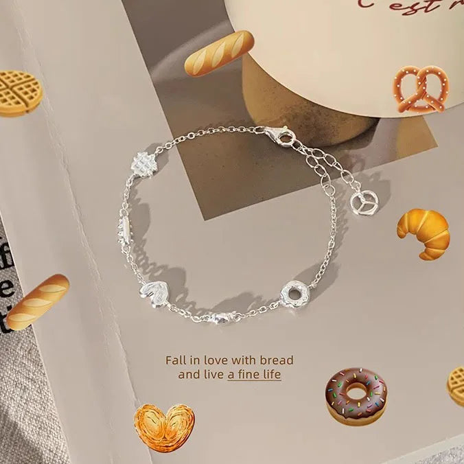 Delight in playful elegance with this sterling silver dessert-themed bracelet, designed for women who love unique, minimalist jewelry. Featuring charming mini waffle and baguette motifs, this bracelet blends geometric simplicity with whimsical flair. Crafted from high-quality 925 sterling silver and finished with a durable PVD gold coating, it’s perfect for everyday wear or as a thoughtful gift. Lightweight and comfortable, it adds a sweet touch to any outfit. Whether you're dressing up for brunch or adding a fun twist to your daily style, this bracelet is a deliciously stylish accessory you’ll love to wear.