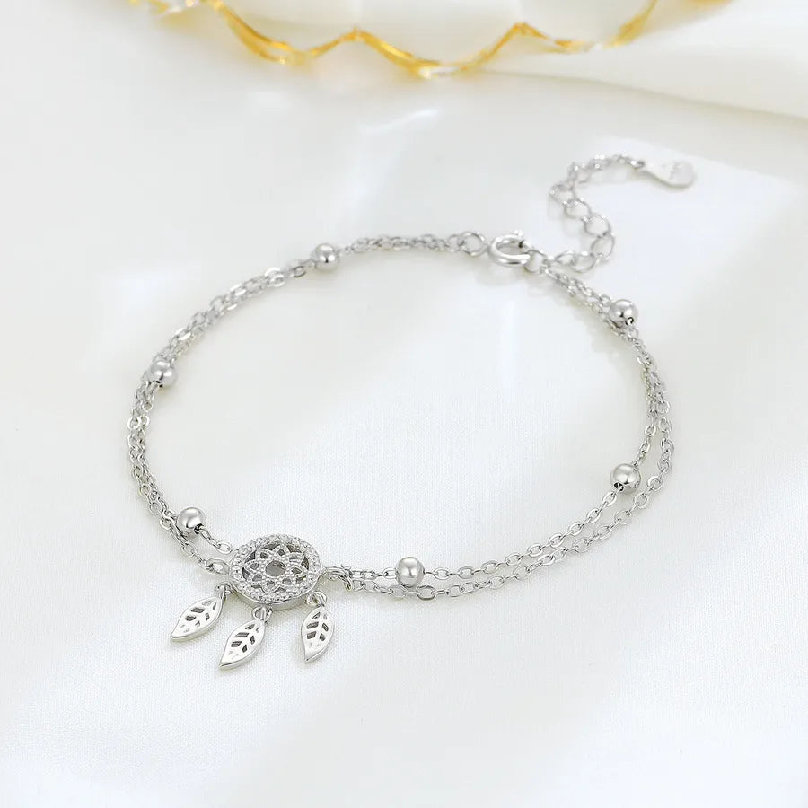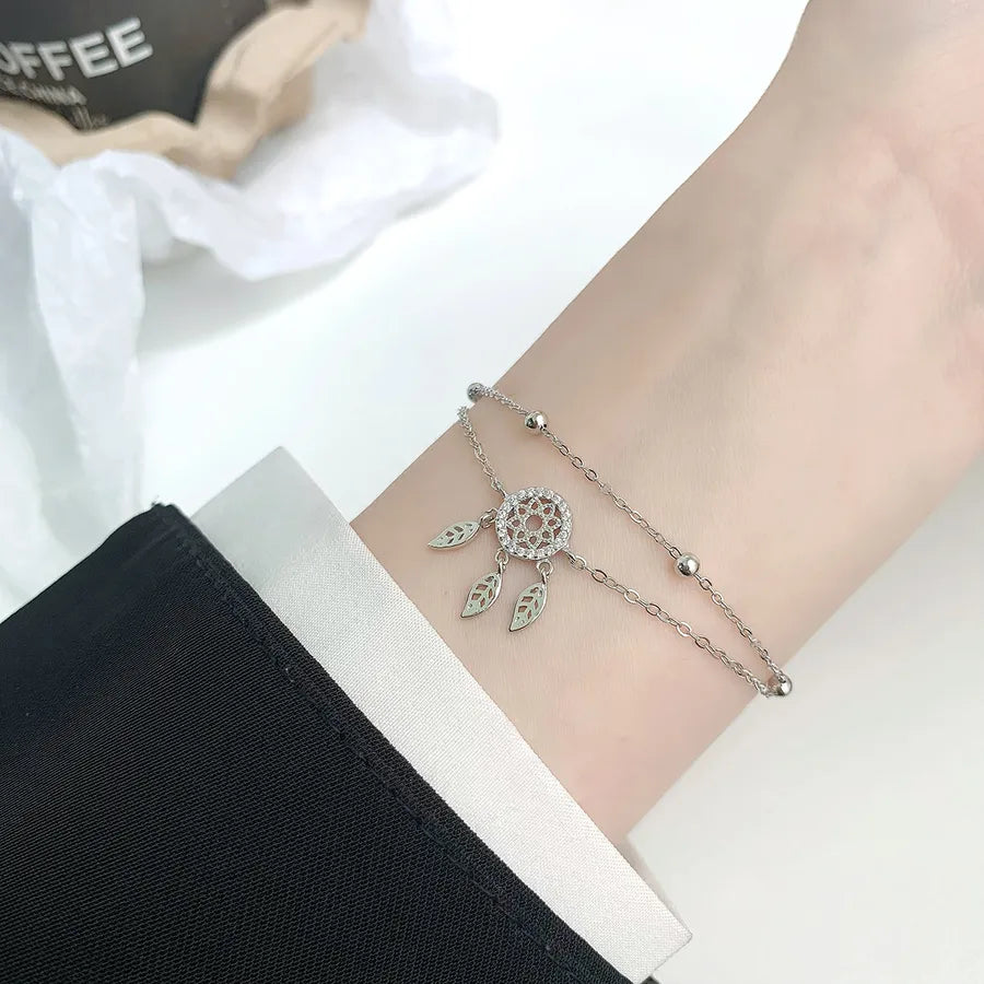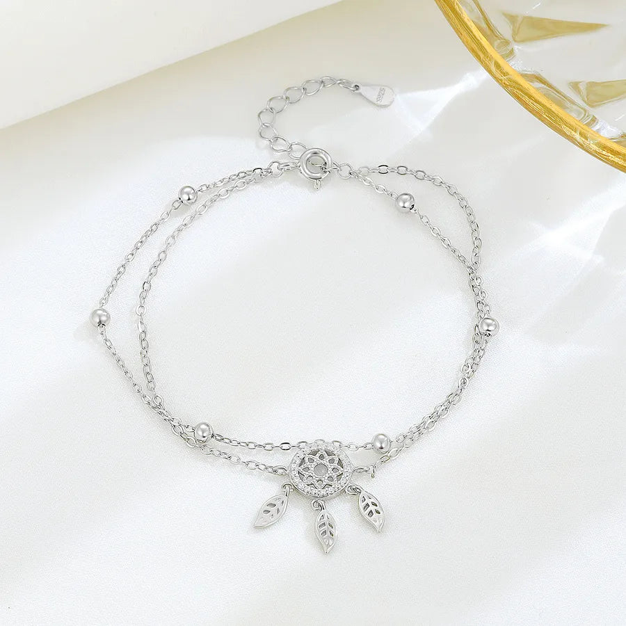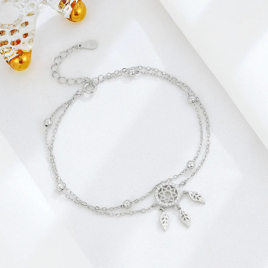 Elevate your accessory game with this elegant double-layer bracelet, crafted from premium 925 sterling silver and finished with a platinum plating for lasting shine. Featuring a delicate dreamcatcher design accented with geometric and leaf motifs, this bracelet blends bohemian charm with modern sophistication. Lightweight and comfortable at just 3g, it’s perfect for everyday wear or special occasions. Whether you're dressing up or down, this piece adds a personalized touch to any outfit. Its sweet and elegant style makes it a thoughtful gift for someone special or a cherished addition to your own jewelry collection.