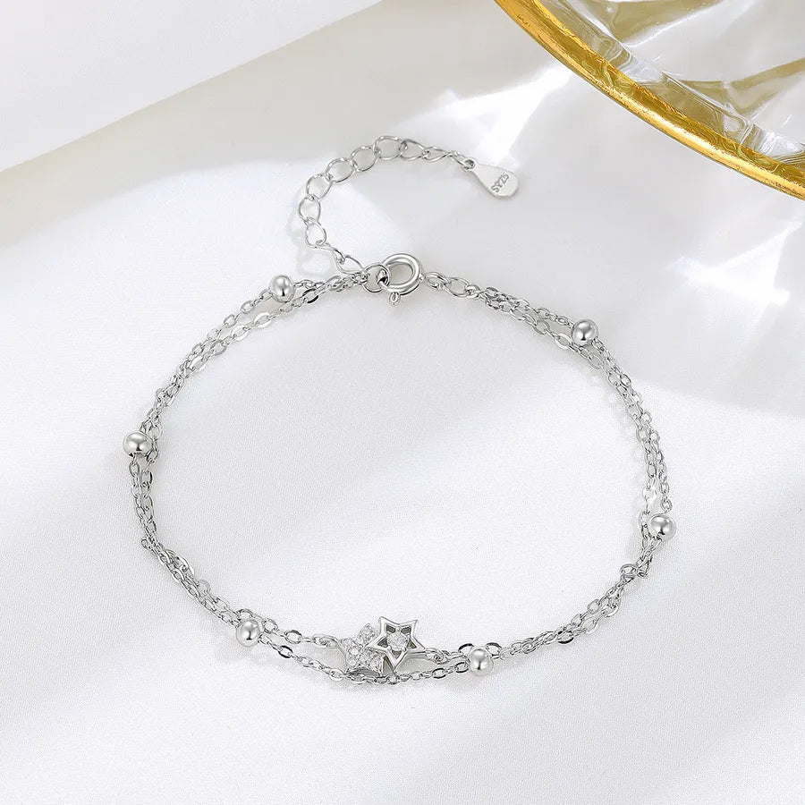 Elevate your everyday look with this Sterling Silver Double Star Layered Bracelet, designed for women who love timeless elegance with a modern twist. Crafted from high-quality 925 sterling silver and finished with a platinum plating, this bracelet features a delicate double-layered chain adorned with twin star charms. Lightweight and comfortable, it’s perfect for daily wear or special occasions. The minimalist yet classic design makes it easy to pair with any outfit, whether casual or dressy. Add a touch of celestial charm to your jewelry collection with this graceful and versatile accessory.