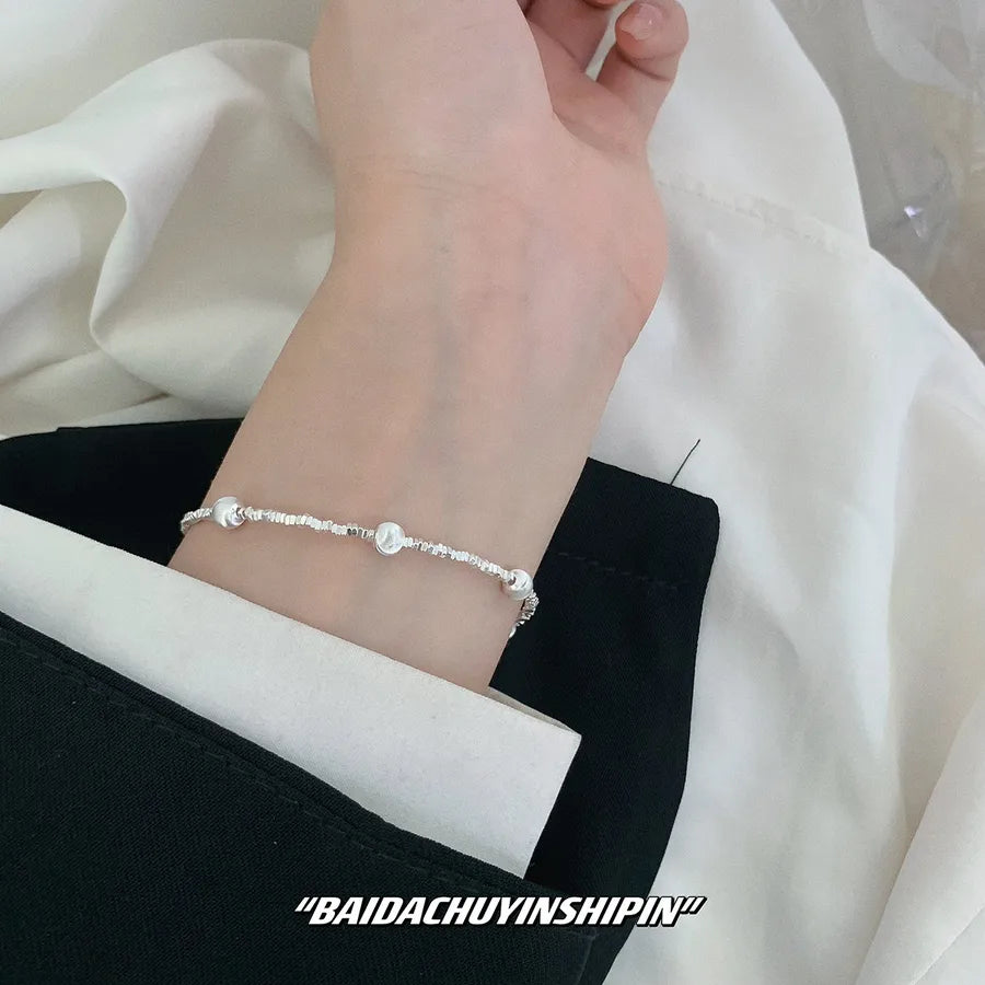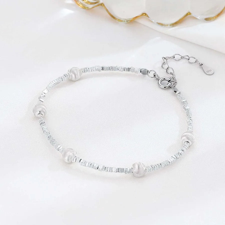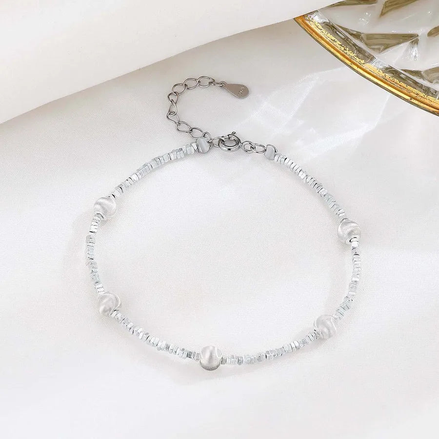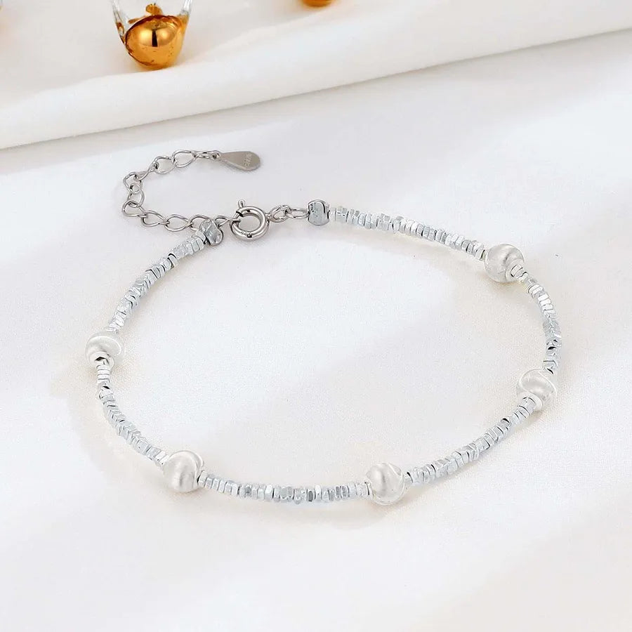 Elevate your everyday look with this Sterling Silver Geometric Bead Bracelet, designed for women who appreciate minimalist elegance. Crafted from high-quality 925 sterling silver and finished with a platinum plating, this bracelet features a unique mix of round beads and chunky square fragments for a modern geometric appeal. Lightweight at just 4g, it offers comfort without compromising on style. Whether worn alone or layered with other pieces, this bracelet adds a refined touch to any outfit. Perfect for casual wear or special occasions, it’s a versatile accessory that complements both elegant and sweet fashion styles.