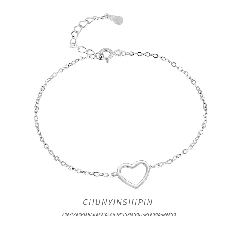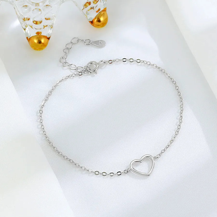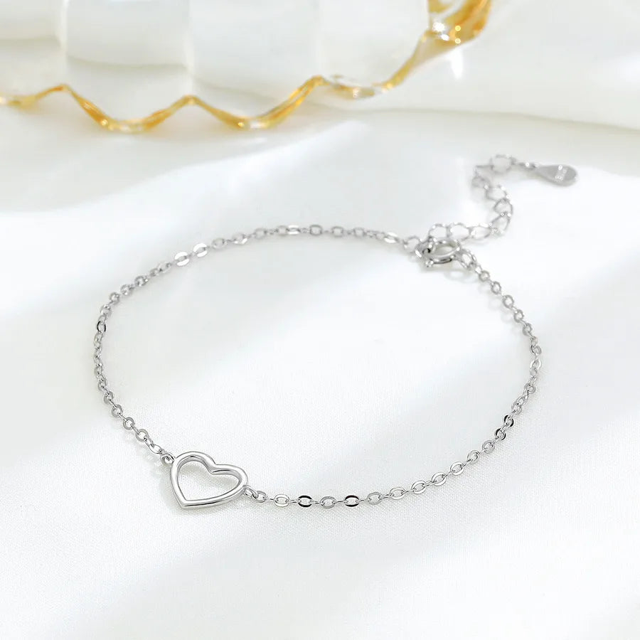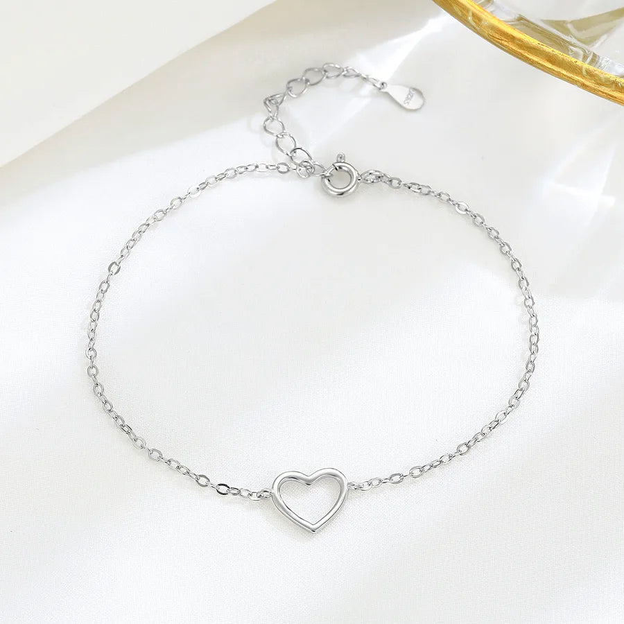 Delicate and timeless, this Sterling Silver Hollow Heart Bracelet adds a touch of elegance to any outfit. Crafted from high-quality 925 sterling silver and finished with a platinum plating, it features a minimalist open-heart design that symbolizes love and simplicity. Lightweight and refined, this bracelet is perfect for daily wear or special occasions. Its sweet and elegant style makes it a thoughtful gift for someone special or a charming addition to your own jewelry collection. Designed to complement any look, it’s a versatile piece that radiates sophistication and grace.