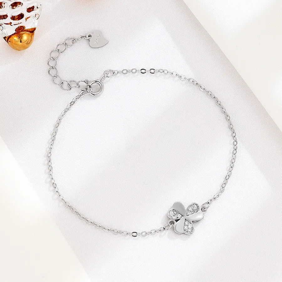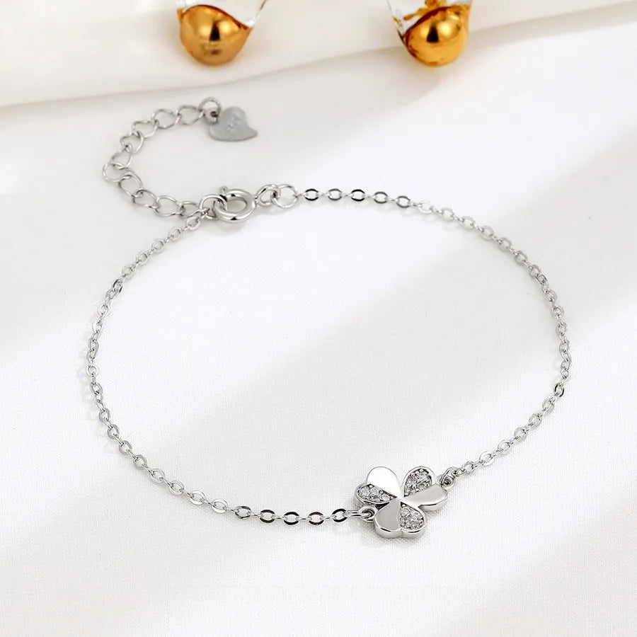 Celebrate elegance and good fortune with this Sterling Silver Three-Leaf Clover Bracelet. Crafted from premium 925 sterling silver, this dainty accessory features a delicate clover design embedded with sparkling cubic zirconia stones. Its versatile and timeless style makes it perfect for everyday wear or special occasions. Lightweight and comfortable, it adds a subtle touch of charm to any outfit. Whether you're gifting it to a best friend or treating yourself, this bracelet is a symbol of luck and love. Elevate your jewelry collection with this sweet and stylish piece that complements every look effortlessly.