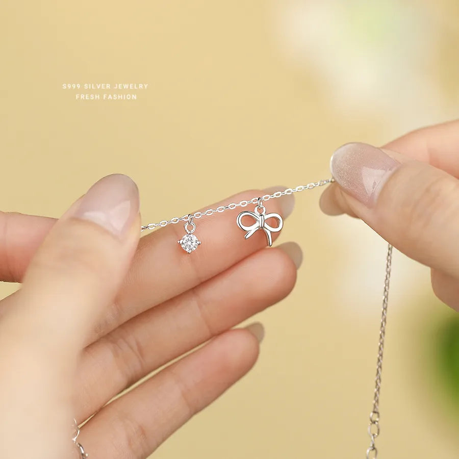 Delicate and feminine, this S999 pure silver bracelet features a charming butterfly knot design that adds a sweet and elegant touch to any outfit. Platinum plating enhances its shine and durability, while micro-set zircon stones provide a subtle sparkle. Perfect for daily wear or as a thoughtful gift, this lightweight bracelet blends classic and modern styles effortlessly. Whether you're dressing up for a special occasion or adding a graceful accent to your everyday look, this bracelet is a timeless addition to your jewelry collection.