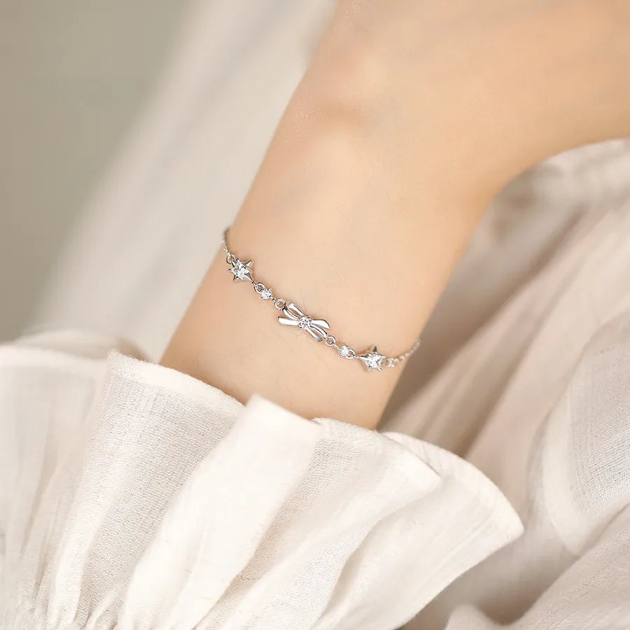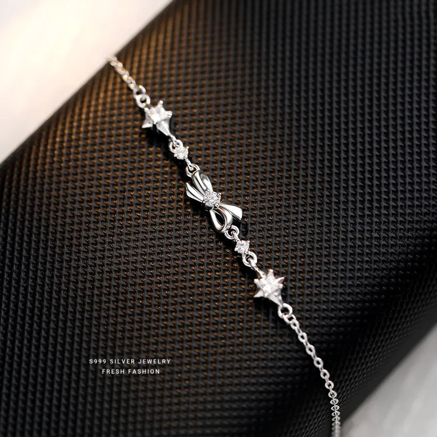 Elevate your everyday style with this elegant S999 pure silver bracelet, featuring a delicate bow knot and shimmering starburst design. Platinum-plated for added brilliance and durability, this lightweight accessory is perfect for daily wear or special occasions. The micro-set zircon stones add a subtle sparkle, making it a timeless piece for any jewelry collection. Whether you're dressing up for work or adding charm to your weekend look, this bracelet offers a versatile and fashionable touch. Its classic yet modern design makes it a thoughtful gift or a personal favorite you'll reach for often.