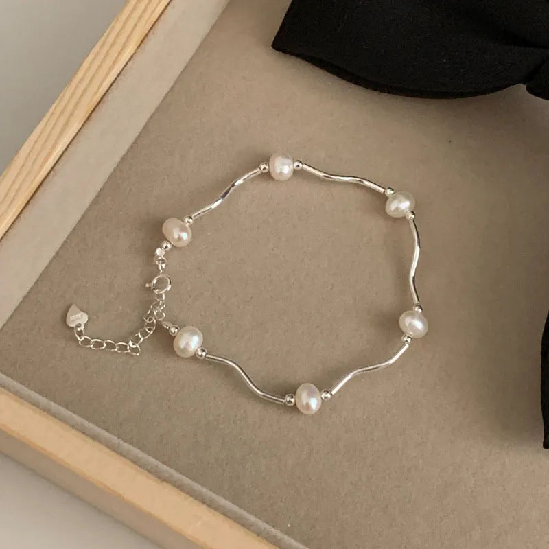 Elevate your everyday look with this elegant freshwater pearl bracelet, crafted from high-quality 925 sterling silver. Featuring a minimalist wave design, this piece blends modern simplicity with timeless charm. The lustrous pearl adds a touch of sophistication, making it perfect for both casual and professional settings. Lightweight and comfortable, it’s ideal for daily wear while offering a refined, retro-inspired aesthetic. Whether worn solo or layered with other pieces, this bracelet is a versatile addition to any jewelry collection. Designed for women who appreciate subtle elegance and contemporary style, it’s a must-have accessory for any wardrobe.