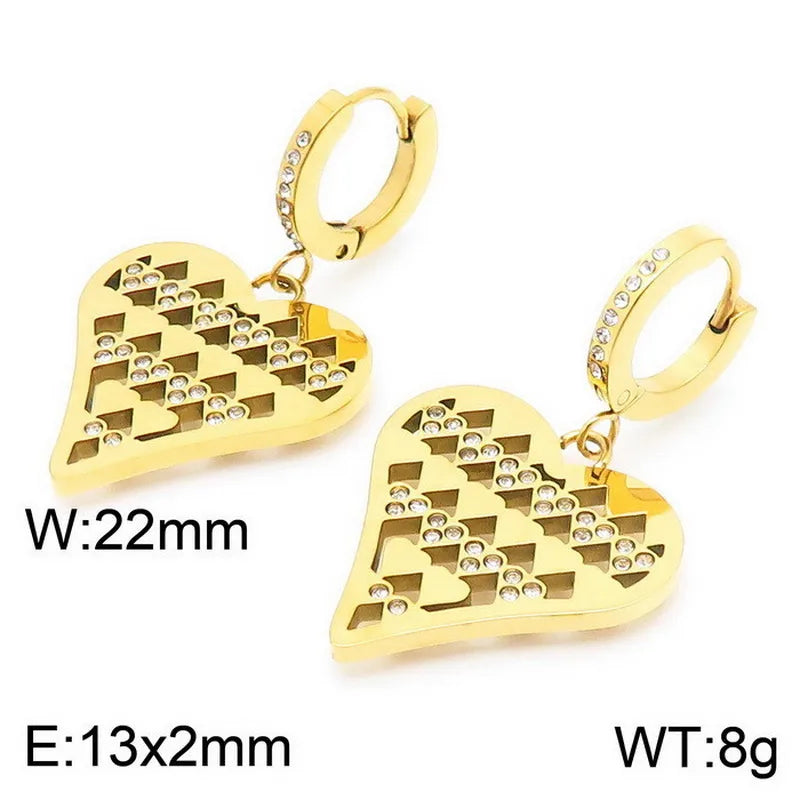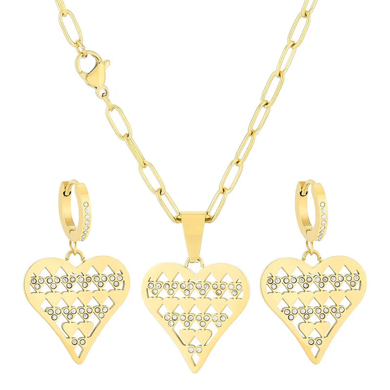 Make a bold statement with this retro-inspired heart-shaped jewelry set, featuring a pair of earrings and a matching necklace. Crafted from durable titanium steel and finished with a luxurious 18K gold PVD coating, this set combines hip-hop flair with timeless elegance. Designed for women who love to stand out, the waterproof and non-tarnish finish ensures long-lasting shine and wearability. Perfect for streetwear looks or adding a touch of edge to any outfit, this set is both fashionable and functional. Lightweight at just 12g, it offers comfort without compromising on style.