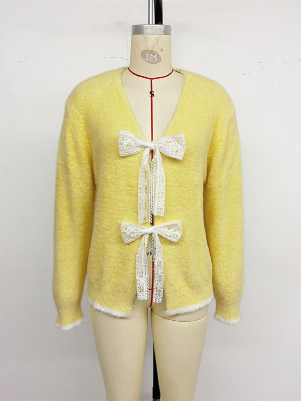 Cardigã de malha com decote em V e detalhe de laço em blocos de cor