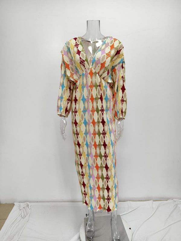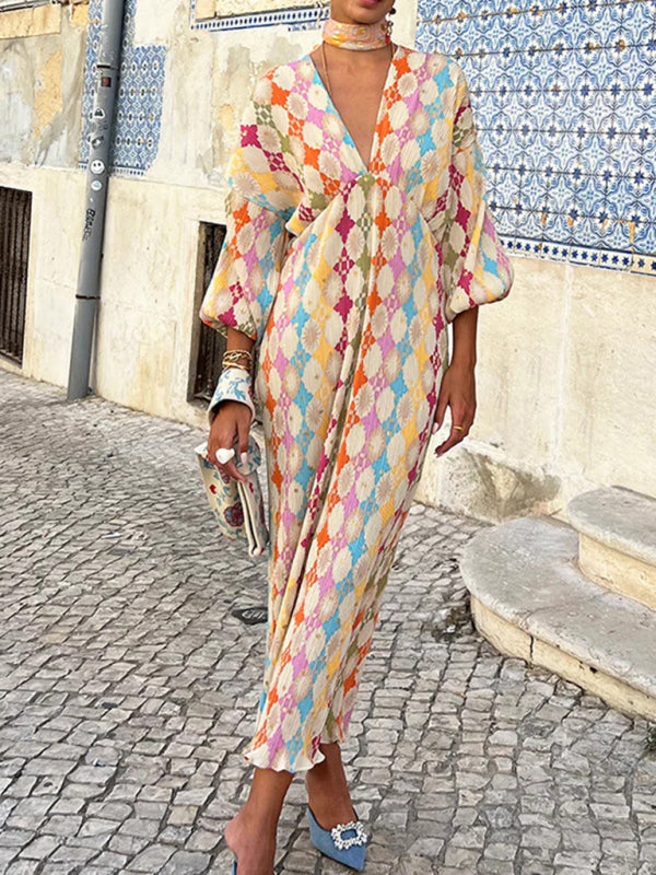 Cream V-Neck A-Line Midi Dress – Lantern Sleeves, Lightweight, All-Season Fit