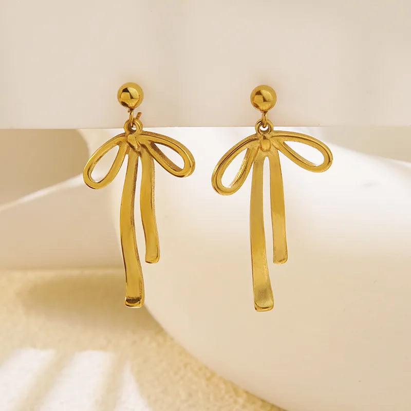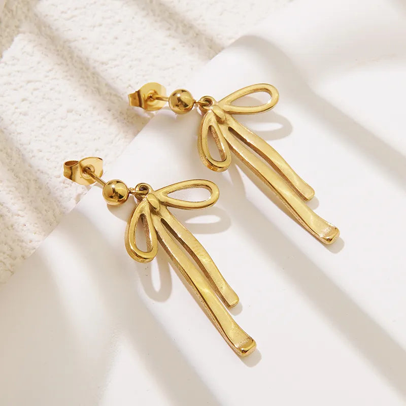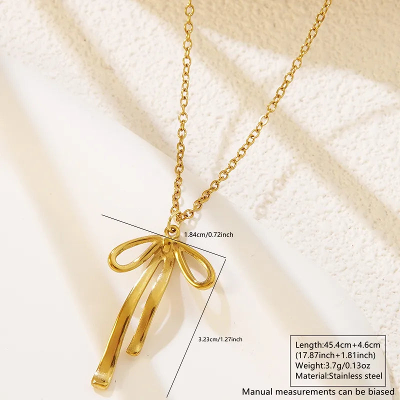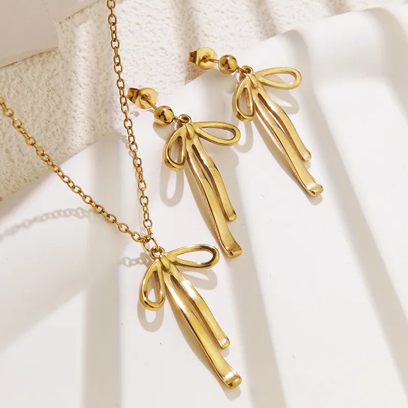 Elevate your everyday or holiday look with this elegant Gold Bow Knot Necklace & Earrings Set. Crafted from durable 304 stainless steel and finished with 18K gold plating using electroplating and PVD coating, this matching jewelry set offers a modern yet timeless appeal. The delicate bow knot design adds a feminine touch, while the cable chain ensures a secure and comfortable fit. Perfect for women who appreciate minimalist elegance, this set is ideal for gifting or personal wear. Designed for all seasons, it effortlessly complements both casual and formal outfits with a touch of golden charm.