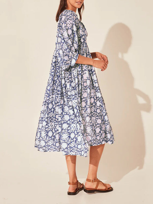 Floral Boho Long Sleeve Dress – High Waist, V-Neck, Lantern Sleeves